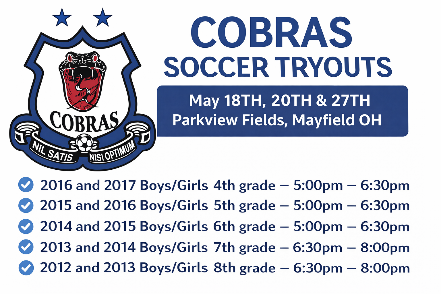 Tryouts are an integral part of the process of selecting a club. We believe there needs to be a mutual strong desire to join the Cobras between the new player and the club for a successful merger. Our tryouts are structured to have the prospective player join in with a regular training session with their possible future teammates while working with one of the many qualified staff coaches. This process not only helps the player get an overall feel for the club but also provides the coaching staff the opportunity to observe the player’s level of skill and tactical understanding.